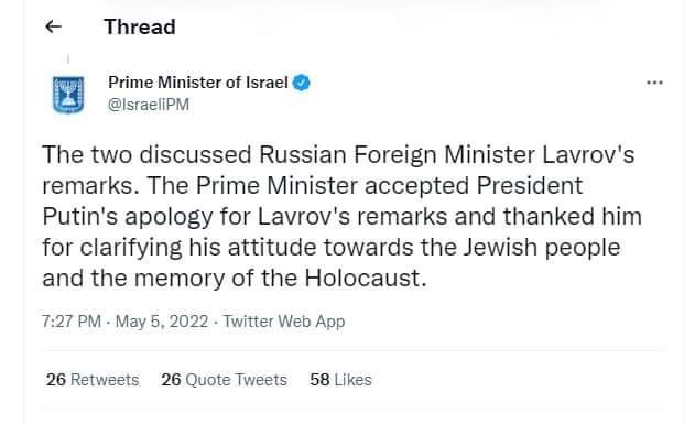 Anterior, Kremlinul a transmis un comunicat despre discuția telefonică a celor doi oficiali, fără însă a face vreo referire la disputa diplomatică uriașă izbucnită după ce ministrul rus de Externe Serghei Lavrov a spus într-un interviu televizat că dictatorul nazist Adolf Hitler avea origini evreiești, iar Israelul a calificat afirmațiiile drept neadevărate, impardonabile și scandaloase.