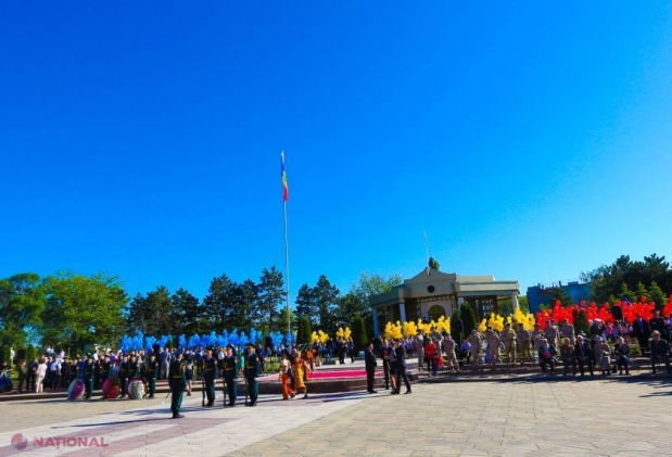 Fetițe cu panglica Sf. Gheorghe prinsă în păr, băieței îmbrăcați în uniforme sovietice și tineri ...