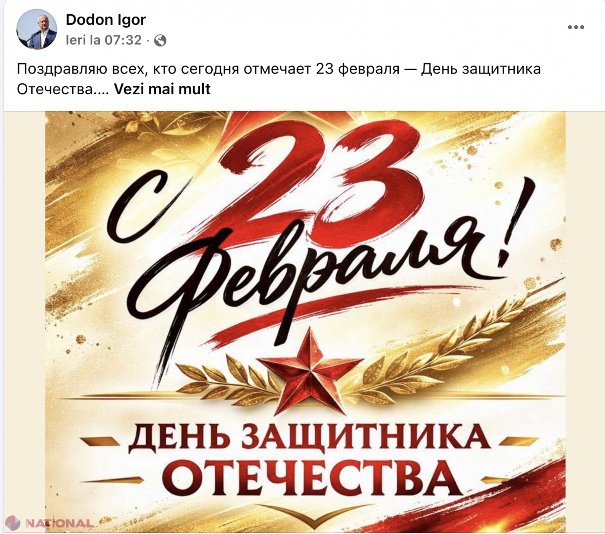 Mai mult, Igor Dodon nu a uitat să îi felicit ieri „pe toți cei care sărbătoresc 23 februarie - Ziua Apărătorului Patriei”.