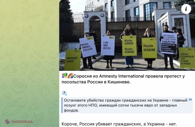 „Sorosiștii de la „Amnesty International” au protestat în fața Ambasadei Rusiei la Chișinău. „Opriți uciderea civililor în Ucraina” este sloganul principal al acestui ONG, care primește sute de mii de euro din finanțare occidentală. Pe scurt, Rusia ucide civili, dar Ucraina nu. Ați înțeles?”, a scris acesta pe Telegram.