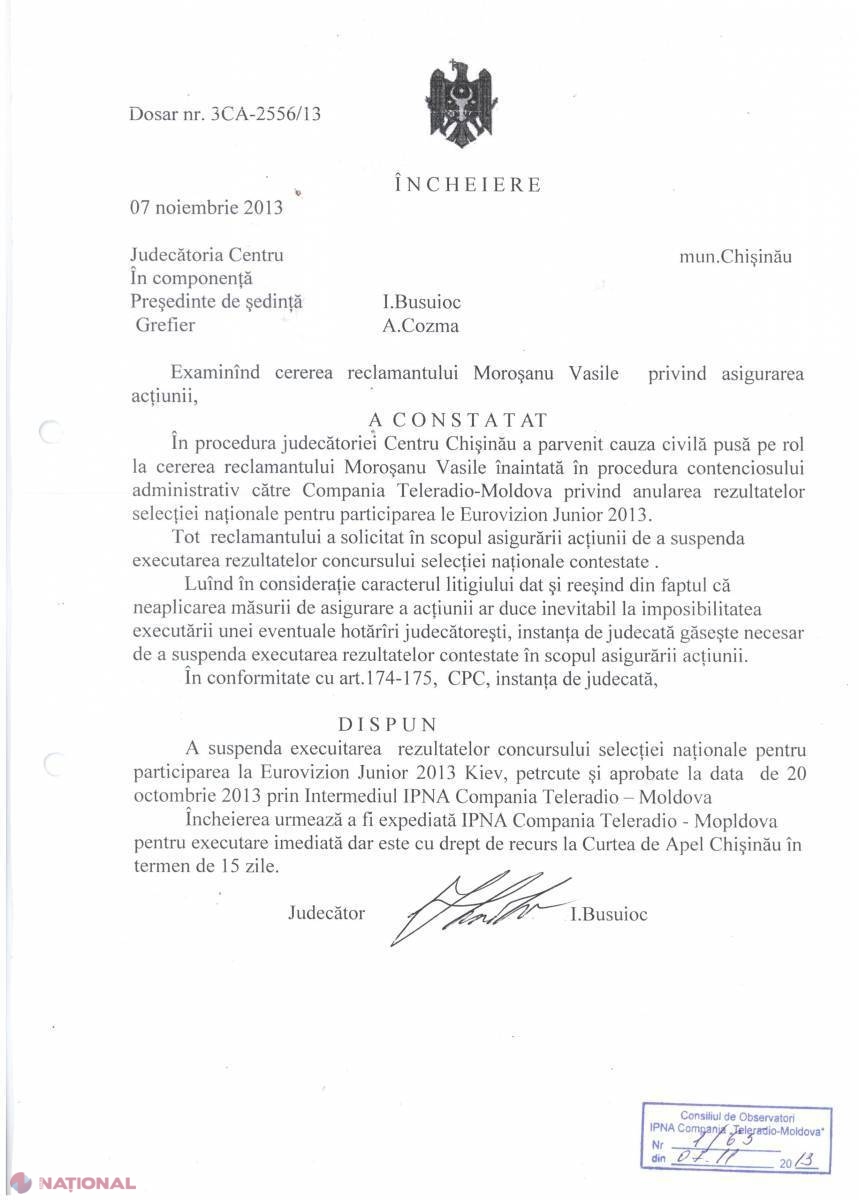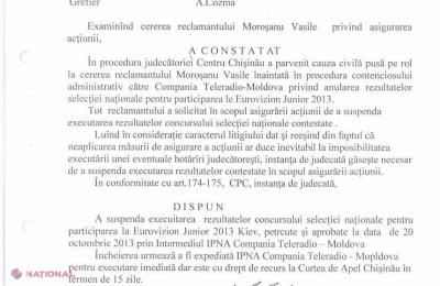 Rafael Bobeica ar putea să nu mai ajungă la Kiev, pentru a reprezenta țara la concursul Eurovision Junior 2013. Rezultatele concursului, care a avut loc pe 20 octombrie 2013, au fost anulate ieri. Judecătoria Centru a emis o decizie de judecată, prin care contestă rezultatele concursului Eurovision Junior 2013. Aceasta vine la solicitarea lui Vasile Moroșanu, unul dintre pedagogii altei concurente. Bărbatul a scris o cerere în care își exprimă nemulțumirea față de modul în care a fost organizat concursul.