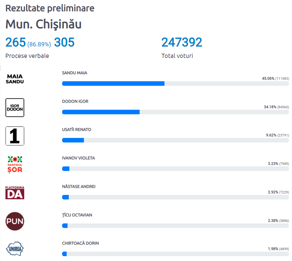 UPDATE // Maia Sandu conduce categoric la votul în municipiul Chișinău. După procesarea a 86,89% din procesele-verbale Maia Sandu are 45,06%, iar Igor Dodon - 34,18 la sută. Pe locul trei este Renato Usatîi - 9,62%. Fostul candidat al Blocului „ACUM” la șefia capitalei, Andrei Năstase, este pe locul cinci, cu 2,92% sau 7 229 de voturi.
