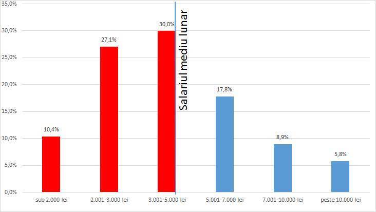 Numai 17,8% primesc salarii lunare între 5 000 și 7 000 de lei, iar 8,9% - între 7 000 și 10 000 de lei.
