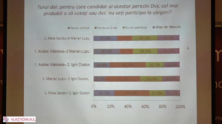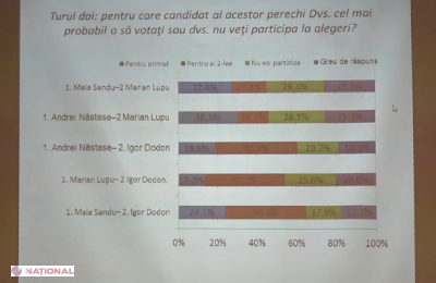 Dacă Andrei Năstase și Marian Lupu ar accede în turul II, atunci pentru primul și-ar da votul 30,5%, iar pentru Lupu puțin peste 15%. 28,5 nu ar merge la vot, iar 25,3 nu au decis.