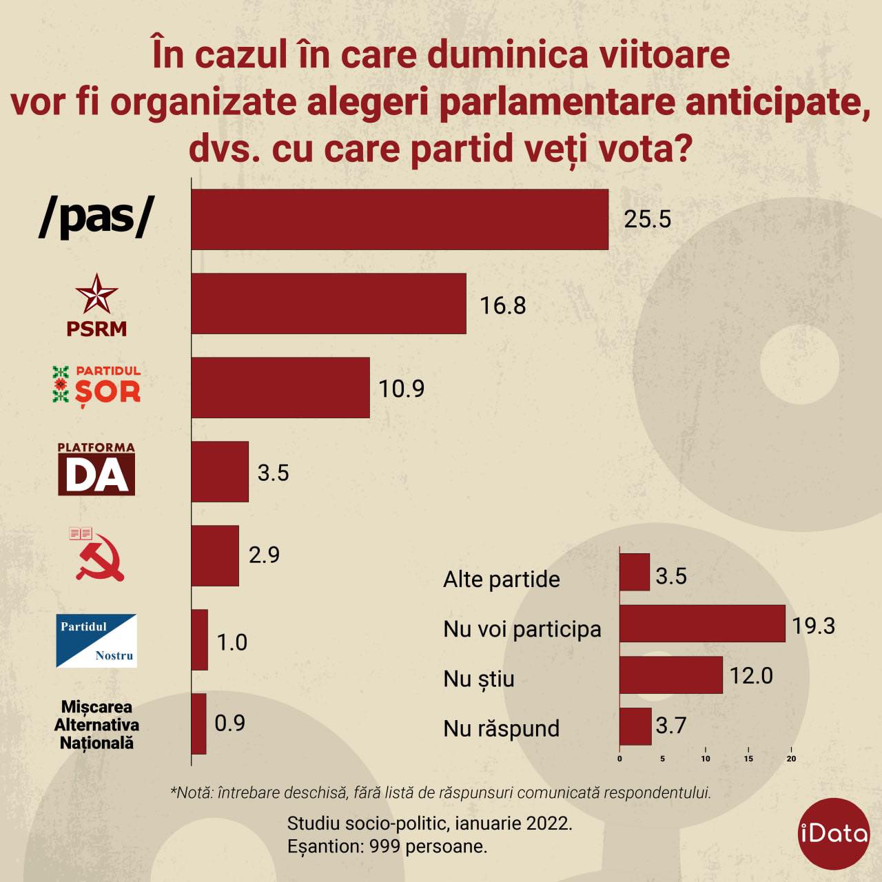 Partidul „ȘOR”, care astăzi are șase deputați, ar avea în caz de anticipate 19 mandate de deputat. Formațiunea lui Șor ar acumula 10,9%.