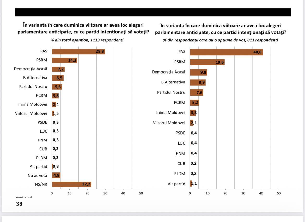 Dacă e vorba de respondenții deciși, atunci PAS ar acumula 40,8%, PSRM - 19,6%, „Democrația Acasă” - câte 9,8%, blocul „Alternativa” - 8,9%, „Partidul Nostru” - 7,6% și Partidul Comuniștilor - 5,2%.