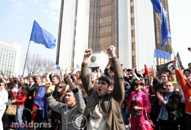 Sute de tineri din R. Moldova, care au ieșit, pe 7 aprilie 2009, să protesteze împotriva re...