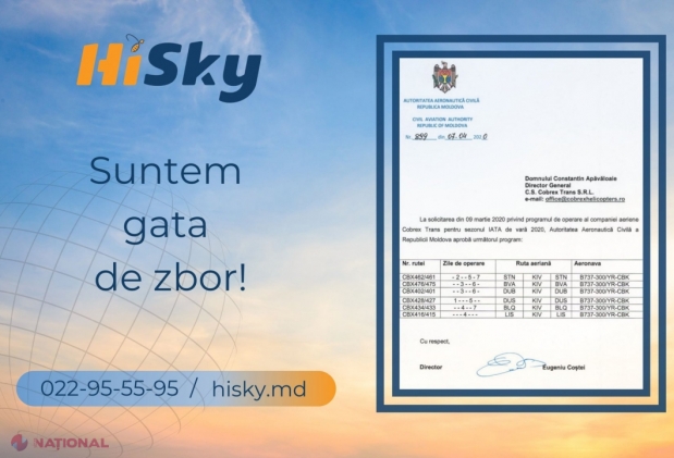 Compania „HiSky” este pregătită pentru efectuarea zborurilor începând cu data de 1 iulie, d...