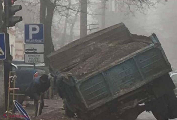 FOTO // Un camion încărcat cu mizerie de pe marginea drumului, rămas blocat cu roțile într-o groapă din asfalt