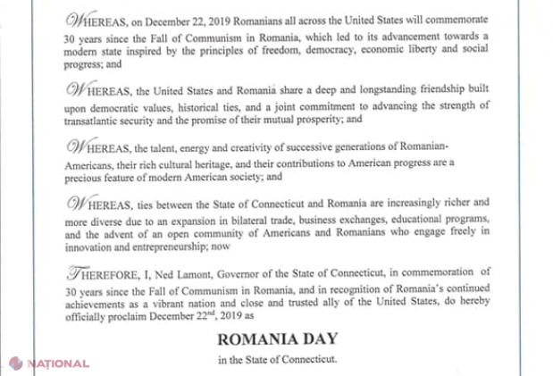 Guvernatorul statului american Connecticut a proclamat ziua de 22 decembrie drept „Ziua României” pentru a celebra 30 de ani de la Revoluția Română din 1989