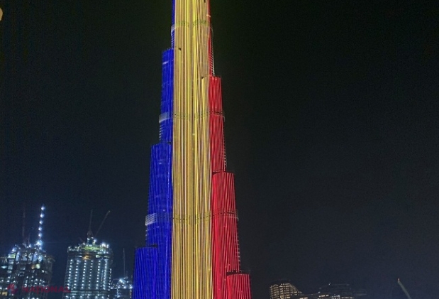 Cea mai înaltă clădire din lume, Burj Khalifa din Dubai, luminată în culorile steagului României