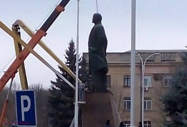 FOTO // Moment istoric: Statuia lui Lenin din Ismail, Ucraina, este DEMONTATĂ