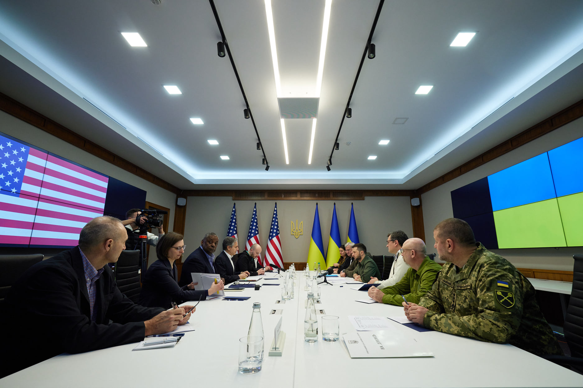 Blinken și Austin au discutat timp de 3 ore cu președintele ucrainean Volodimir Zelenski, duminică seara, la Kiev.