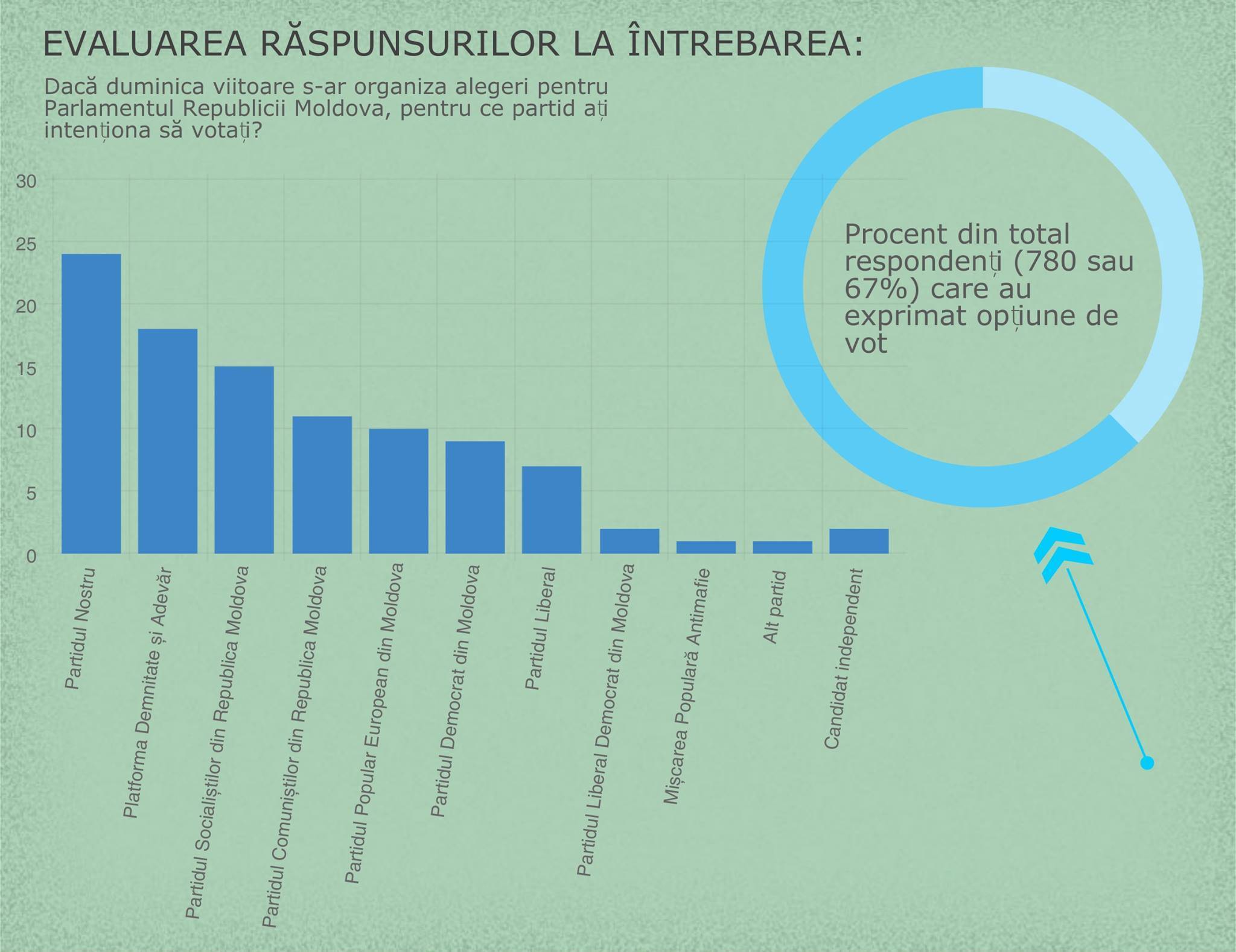 Astfel, Partidul Nostru ar acumula 24% din voturi, iar Platforma DA - 18%. Partidul Socialiștilor ar fi fost votat de 15% din alegători, Partidul Comuniștilor – de 11%, iar Partidul Popular European, condus de Iurie Leancă, ar acumula 10% din voturi.
