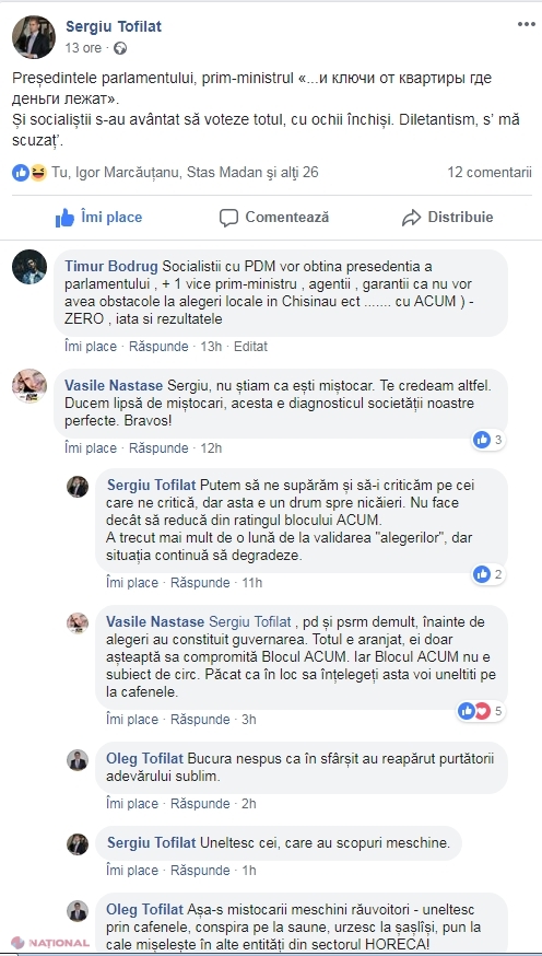 „Președintele Parlamentului, prim-ministrul «...и ключи от квартиры где деньги лежат» (și cheile de la apartamentul unde sunt banii nr.). Și socialiștii s-au avântat să voteze totul, cu ochii închiși. Diletantism, să mă scuzați”, a scris acesta pe Facebook, cu referire la anunțurile Blocului „ACUM” de după alegeri, inclusiv despre propunerile la funcțiile de spicher și premier.