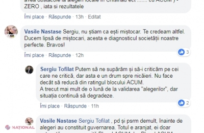 Sergiu Tofilat nu s-a lăsat intimidat și a subliniat că Blocul „ACUM”, prin cerințele înaintate, merge spre nicăieri: „Putem să ne supărăm și să-i criticăm pe cei care ne critică, dar asta e un drum spre nicăieri. Nu face decât să reducă din ratingul Blocului „ACUM”. A trecut mai mult de o lună de la validarea „alegerilor”, dar situația continuă să degradeze”.