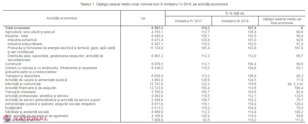 Potrivit Biroului Național de Statistică, în trimestrul patru din 2018 câștigul salarial mediu lunar a fost de 6 987,5 lei, înregistrând o creștere de 14,3% față de aceeași perioadă din 2017.