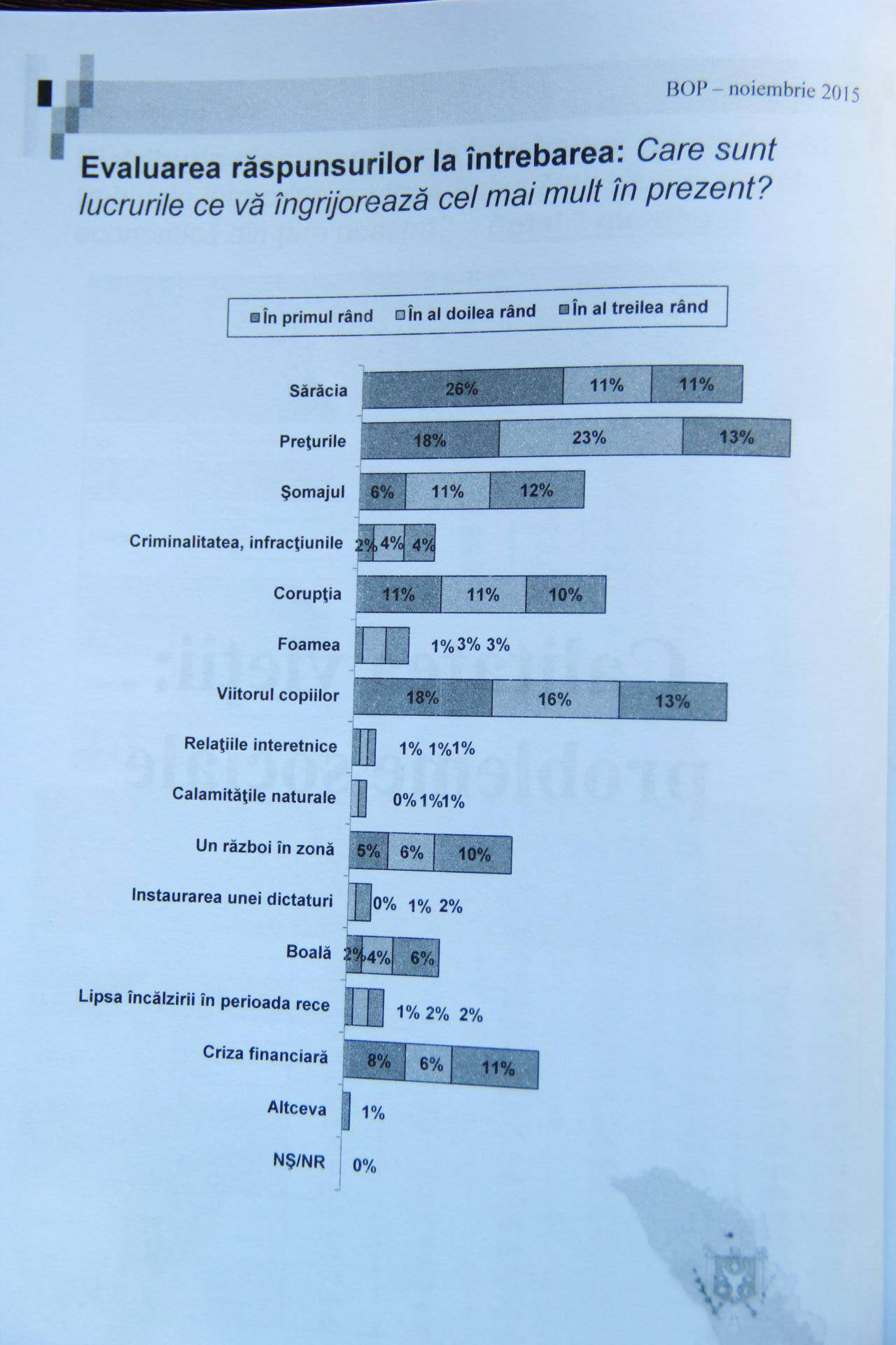 Întrebați care sunt lucrurile ce vă îngrijorează cel mai mult în prezent, 26 la sută din participanții la sondaj au spus că, în primul rând, sărăcia, alți câte 18% – prețurile și viitorul copiilor, 11% - corupția, 8% - criza financiară, 6% - șomajul, 5% - un război în zonă, câte 2% - boala, criminalitatea și infracțiunile, iar 1% - foamea.