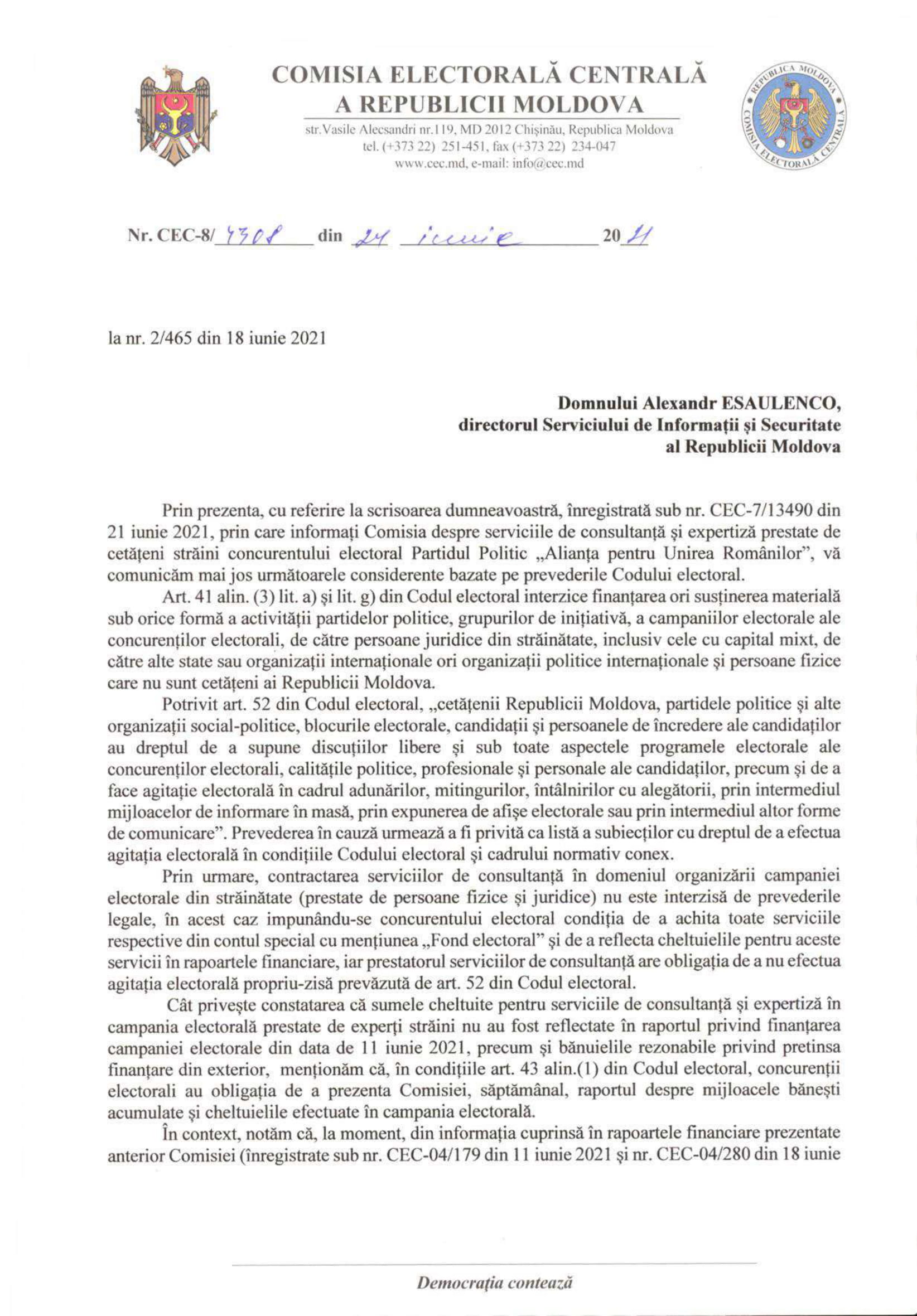 Alianța pentru Unirea Românilor (AUR) ar putea fi exclusă din cursa electorală pentru alegerile parlamentare anticipate din 11 iulie, pentru o presupusă „finanțare externă și implicare a străinilor în campania electorală”. Comisia Electorală Centrală (CEC) a expediat un demers la adresa Serviciului de Informații și Securitate (SIS) pentru a investiga acest caz. Mai mulți membri ai AUR Moldova protestează în aceste momente în fața SIS și solicită să fie primiți în audiență de directorul instituției, Alexandr Esaulenco.