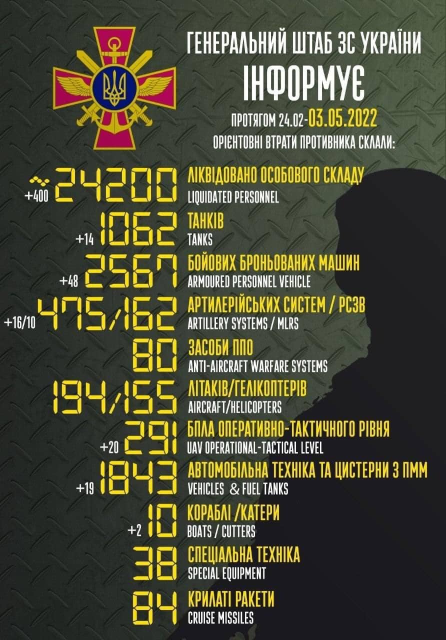 Cel puțin 400 de soldați ruși ar fi fost uciși în cea de-a 68-a zi de război, iar mai multe ținte militare, inclusiv tancuri și blindate, sisteme de artilerie rusești au fost distruse, raportează Statul Major al Forțelor Armate ale Ucrainei.