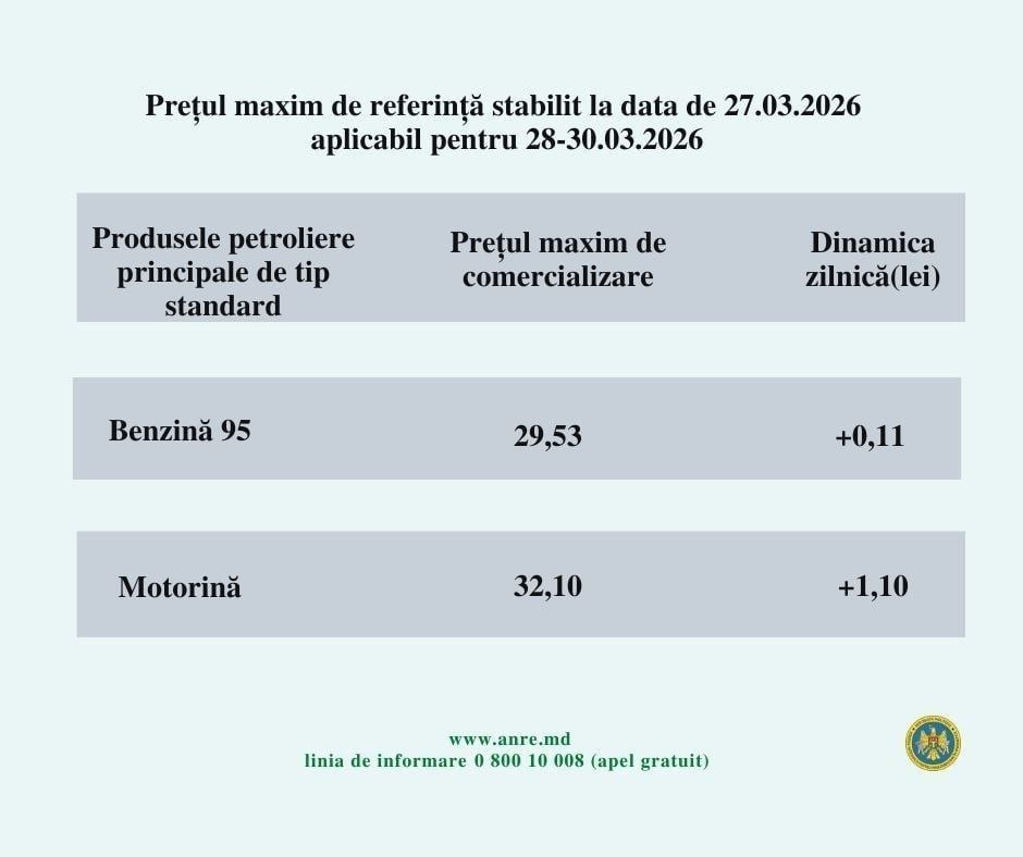 Potrivit prețurilor maxime de comercializare cu amănuntul a produselor petroliere principale de tip standard, stabilite de Agenția Națională pentru Reglementare în Energetică (ANRE), benzina COR 95 va costa 29,53 lei/litru (+11 bani), iar motorina standard - 32,10 lei/litru (1,10 lei).