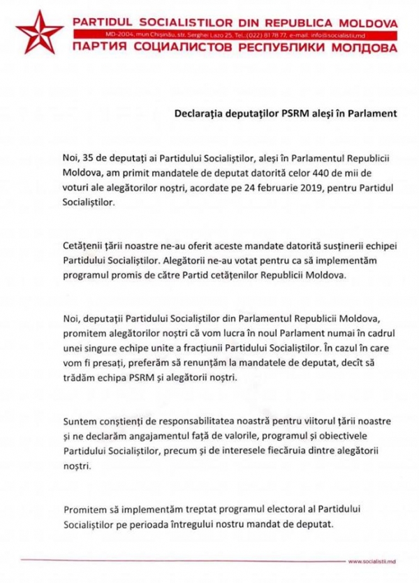 „Promitem că vom lucra împreună în cadrul unei singure echipe. În cazul în care vom fi presați, atunci preferăm să renunțăm la mandatul de deputat”, se spune în angajamentul semnat de cei 35 de aleși ai poporului.