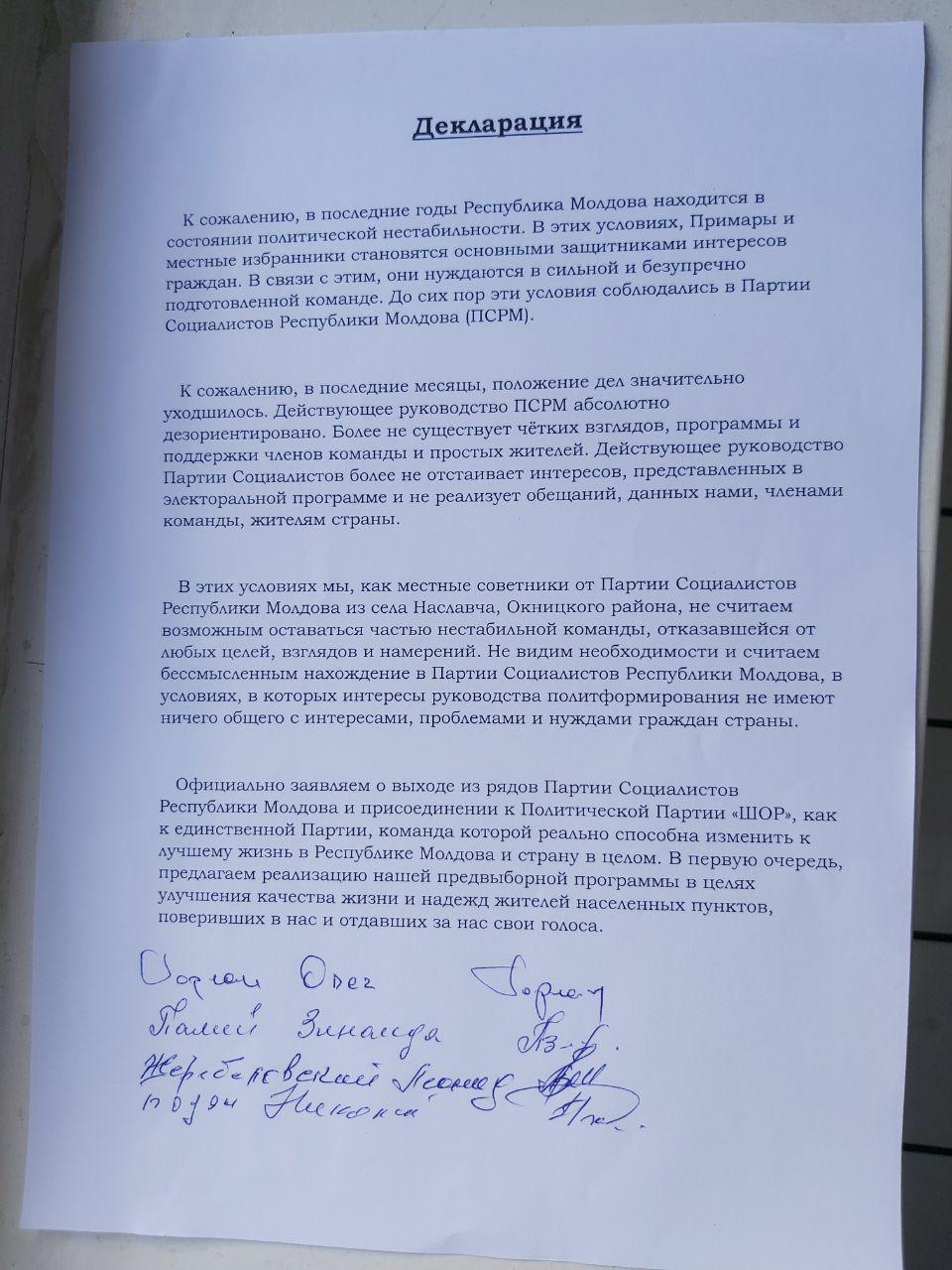 Consilierii de Naslavcea mai anunță că au decis să adere la Partidul „ȘOR” – „singurul partid al cărei echipă poate schimba în bine viața cetățenilor R. Moldova și a țării în general”.