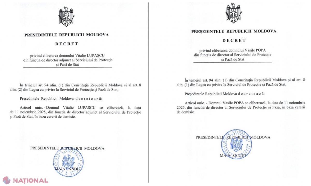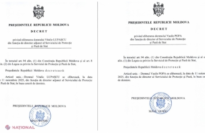 Directorul Serviciului de Protecție și Pază de Stat, DEMISĂ de președinta Maia Sandu (SPPS), Vasile Popa și adjuctul său, Vitalie Lupașcu, au fost eliberați din funcție. Două decrete în acest sens au fost semnate pe 11 noiembrie 2025 de președinta Maia Sandu.