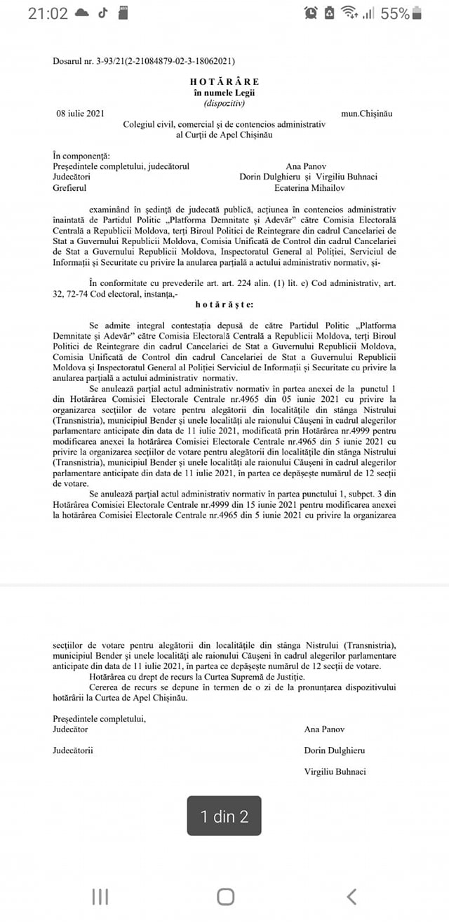 DOC // Curtea de Apel Chișinău ARUNCĂ în aer o altă decizie luată de CEC: MINUS 29 de secții de votare pentru cetățenii R. Moldova din stânga Nistrului. „O victorie mare pentru R. Moldova”