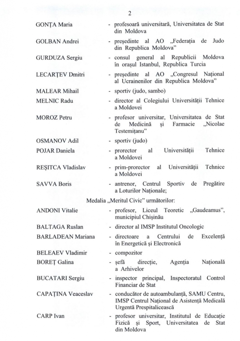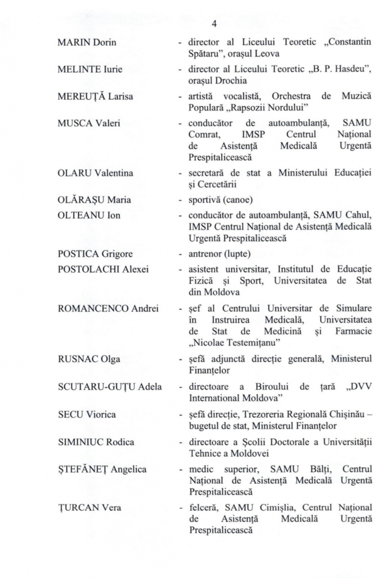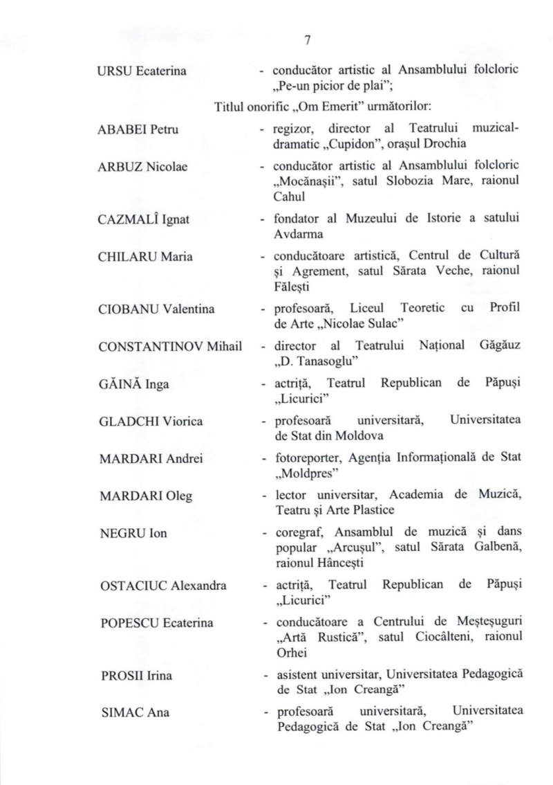 „Distincțiile au fost acordate în semn de înaltă apreciere pentru meritele deosebite față de statul și poporul R. Moldova, pentru munca îndelungată și prodigioasă, profesionalismul și dedicația exemplară în exercitarea atribuțiilor, precum și pentru contribuția la dezvoltarea societății și promovarea valorilor naționale”, se arată în decretul semnat de Maia Sandu.