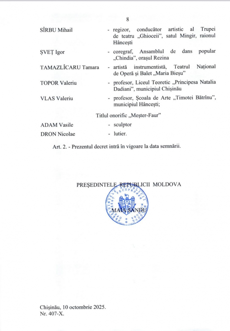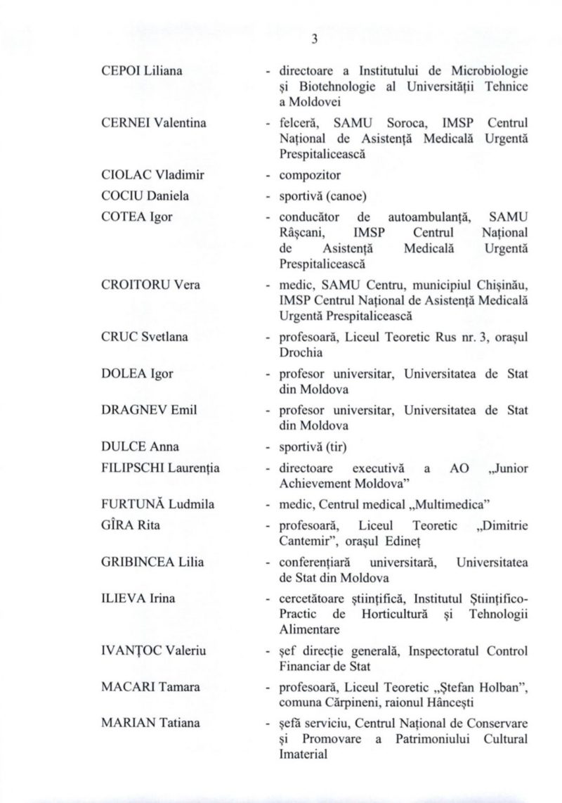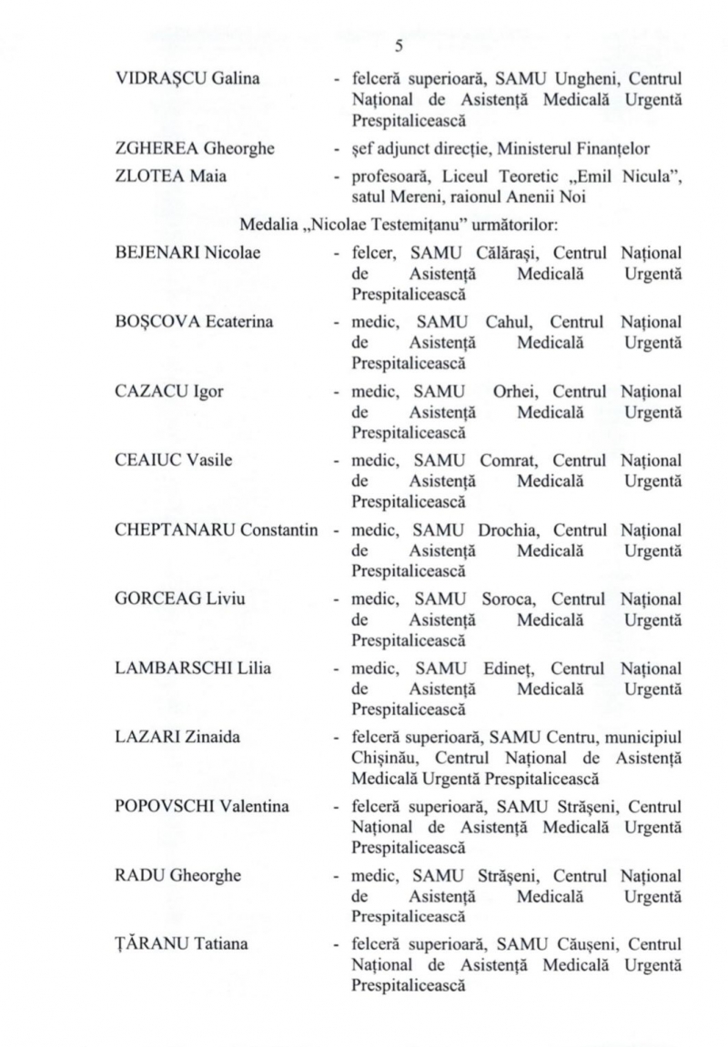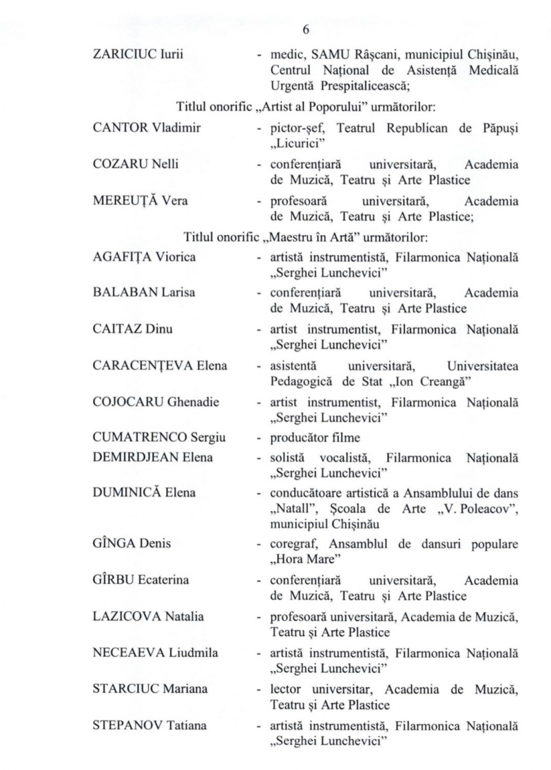 „Distincțiile au fost acordate în semn de înaltă apreciere pentru meritele deosebite față de statul și poporul R. Moldova, pentru munca îndelungată și prodigioasă, profesionalismul și dedicația exemplară în exercitarea atribuțiilor, precum și pentru contribuția la dezvoltarea societății și promovarea valorilor naționale”, se arată în decretul semnat de Maia Sandu.