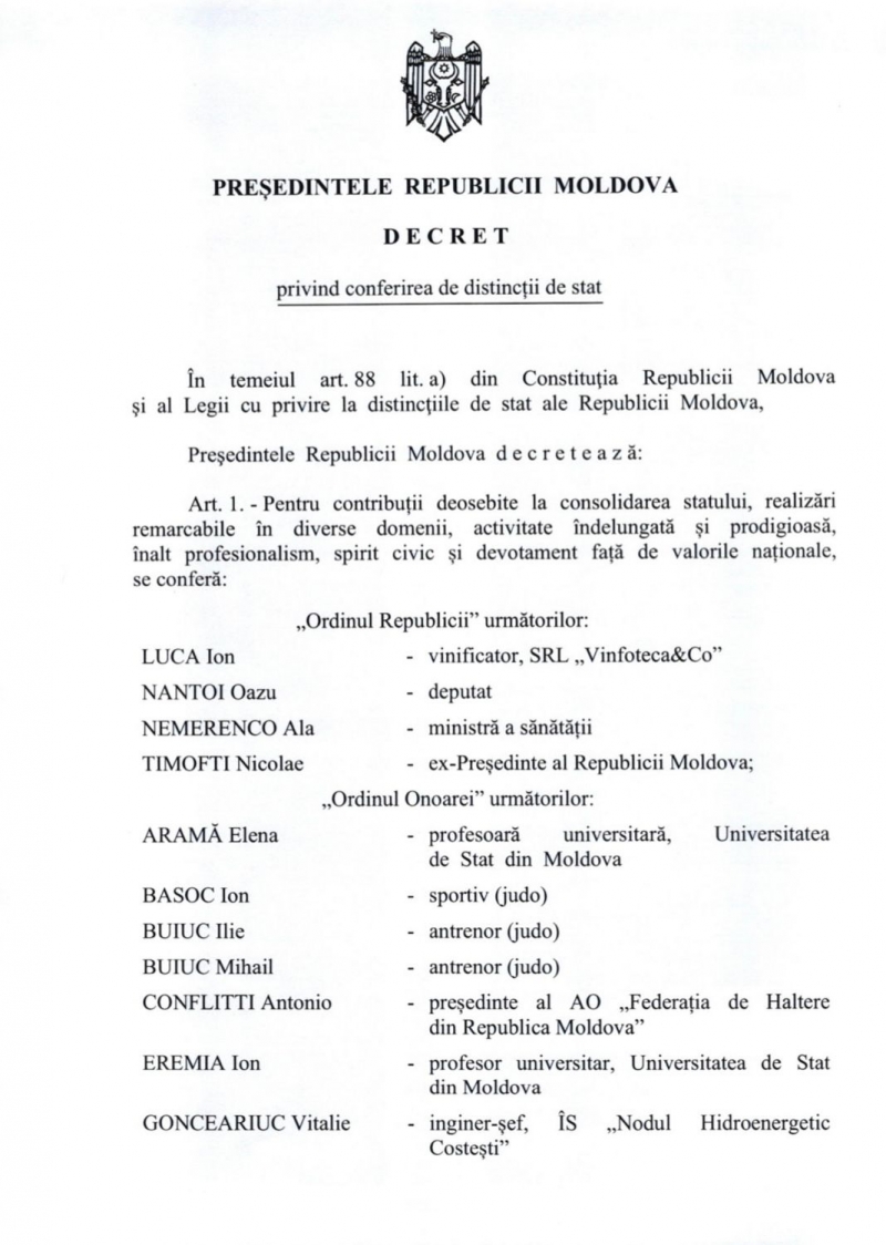 Fostul președinte al R. Moldova, Nicolae Timofti, ministra Sănătății, Ala Nemerenco, deputatul Oazu Nantoi și vinificatorul Ion Luca au fost decorați cu „Ordinul Republicii”, cea mai înaltă distincție de stat din republica noastră. Un decrat în acest sens a fost semnat astăzi de președinta Maia Sandu.