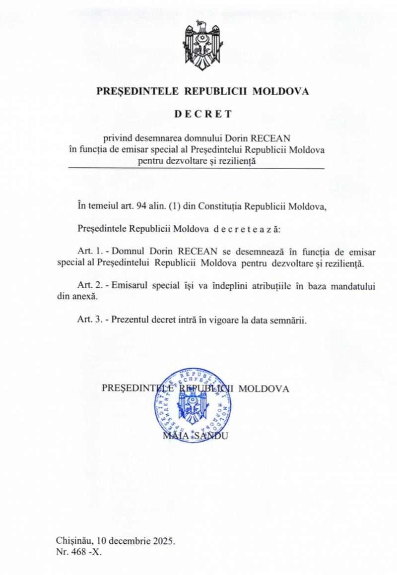 Ex-premierul Dorin Recean, care a condus Guvernul R. Moldova din 2023 și până în toamna anului 2025, a fost numit astăzi în funcția de emisar special al pentru dezvoltare și reziliență. Decretul a fost semnat de președinta Maia Sandu.
