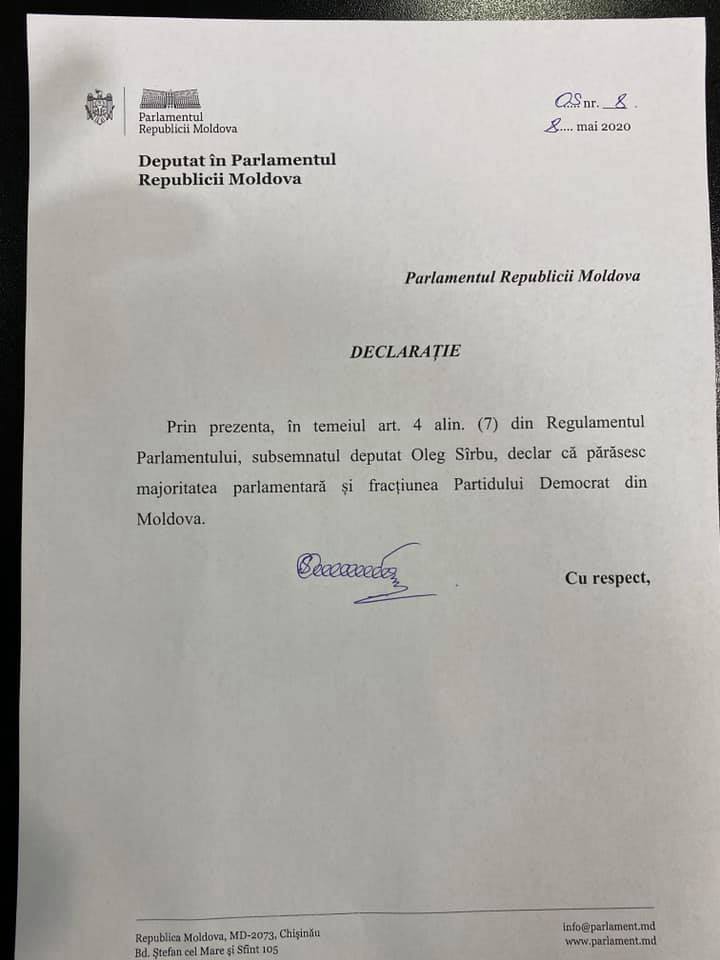 Deputatul Oleg Sîrbu a decis astăzi să părăsească majoritatea parlamentară PSRM - PD, dar și fracțiunea condusă de Dumitru Diacov.