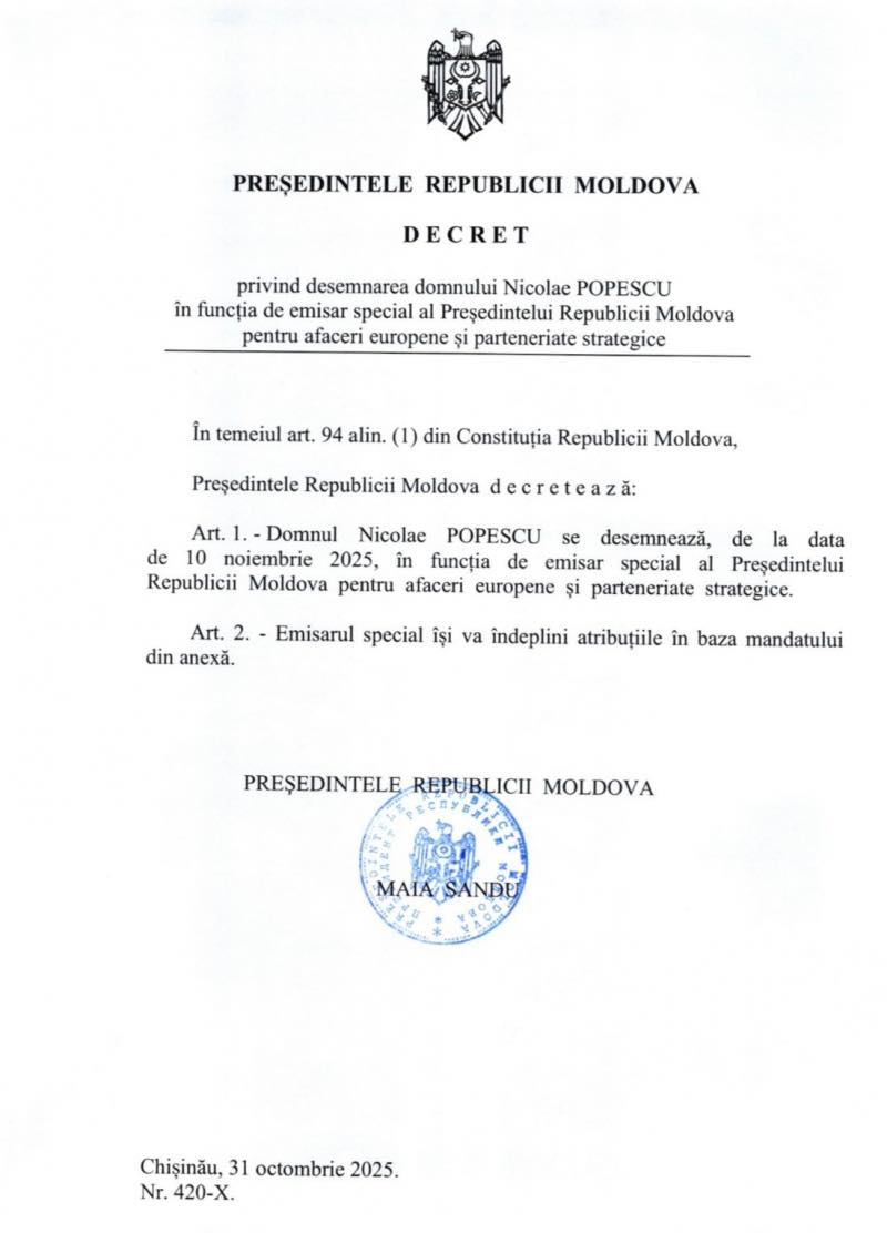 Deputatul Partidului Acțiune și Solidaritate (PAS), Nicu Popescu, a fost desemnat de președinta Maia Sandu în funcția de emisar special pentru afaceri europene și parteneriate strategice. Un decret în acest sens a fost semnat astăzi de șefa statului.