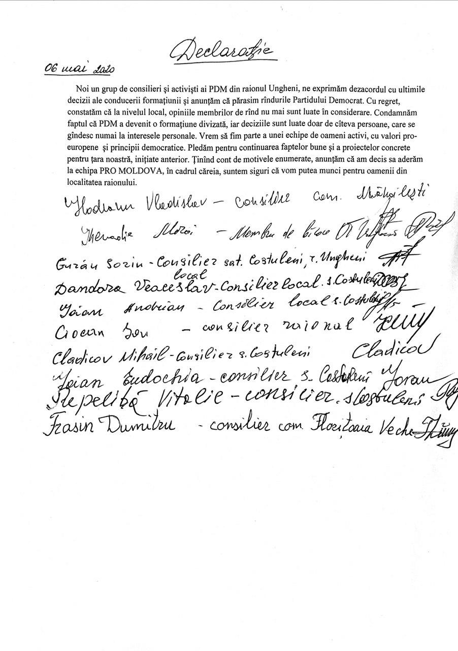 „Ne exprimăm dezacordul cu ultimele decizii ale conducerii PD și constatăm cu regret că opiniile membrilor nu sunt luate în considerare, iar deciziile sunt luate de câteva persoane care se gândesc la interesele personale”, se arată în declarația semnată de consilieri și membri PD din raionul Ungheni.