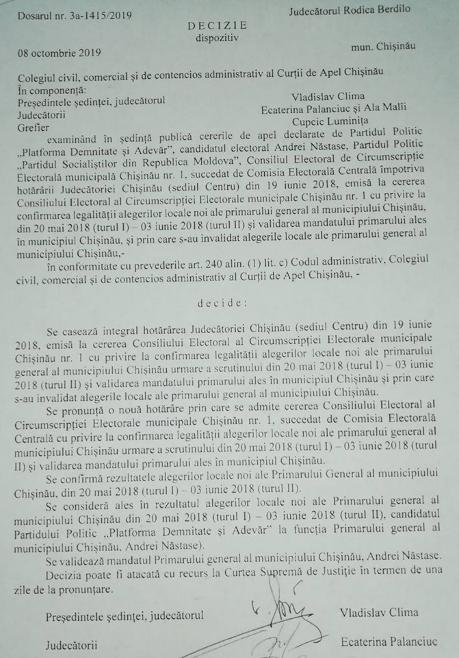 Prin casarea hotărârii luate în 2018 de judecătoarea Rodica Berdilo, au fost confirmate rezultatele plebiscitului de acum un an şi patru luni, prin care Năstase a fost ales în funcția de edil.