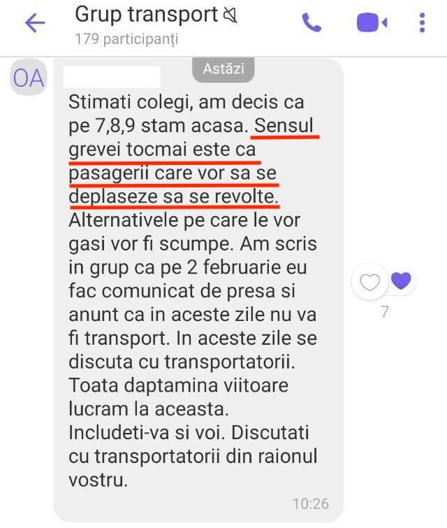 „Un grup mic de transportatori a început să șantajeze o republică întreagă că vor sista cursele de transport. Colegi, mai jos este mesajul celui care îi reprezintă. Scopul e clar: „... să se revolte pasagerii”. E urât. Îndemn toți transportatorii să nu se lase provocați de astfel de comportamente”, a precizat vicepremierul.