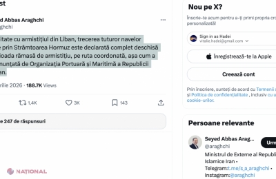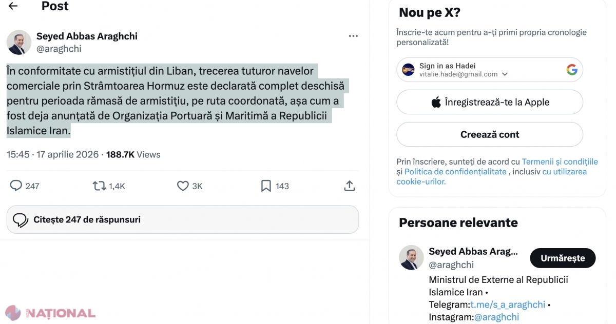 Ministrul iranian de externe, Seyed Abbas Araghchi, a anunțat acum câteva minute (17 aprilie) despre redeschiderea completă a Strâmtorii Ormuz pentru toate navele comerciale. Această decizie este direct corelată cu instaurarea unui armistițiu în Liban și se va aplica pe întreaga durată a încetării focului.