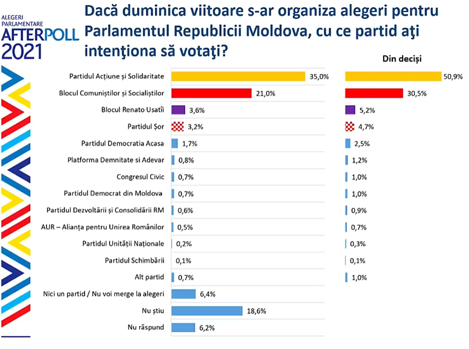 Potrivit cercetării sociologice, în viitorul Parlament ar ajunge Partidul Acțiune și Solidaritate (PAS), creditat cu 35% și Blocul electoral al „Comuniștilor și Socialiștilor” - 21%.
