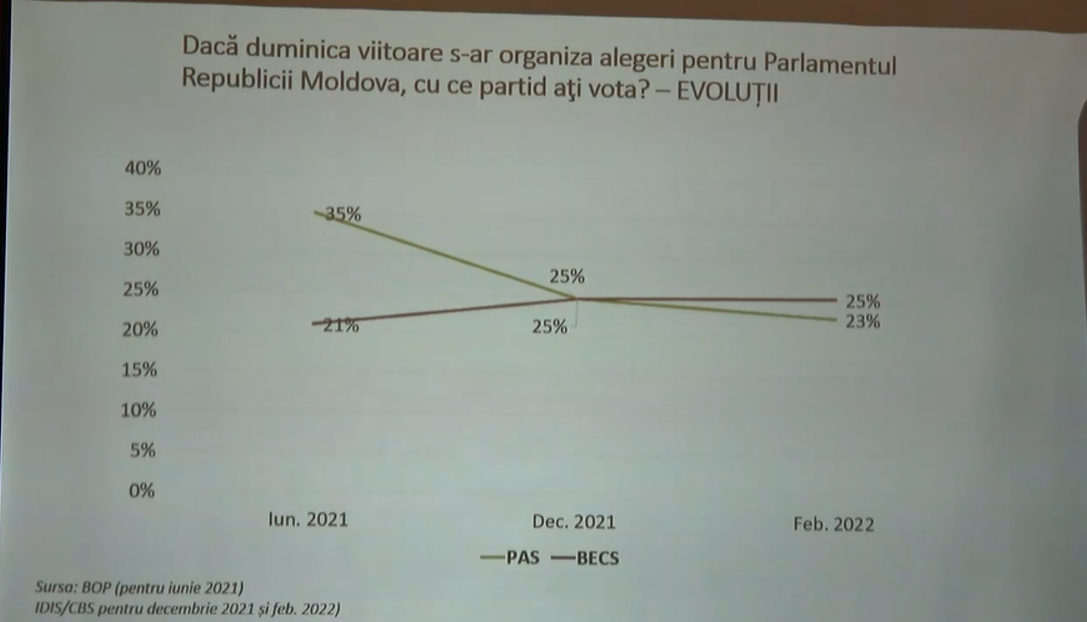 Autorii sondajului au arătat și evoluția opțiunilor de vot ale modovenilor. Astfel, PAS a pierdut 12 la sută din iunie 2021 și până în prezent. De partea cealaltă, BeCS a crescut cu 4% din iunie 2021 și până acum.