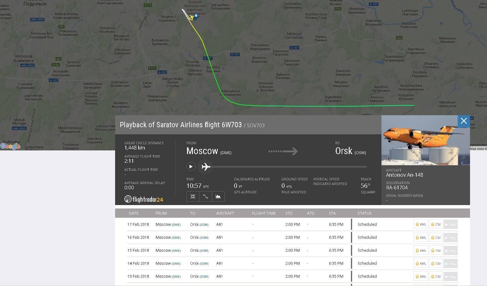 UPDATE // Potrivit site-ului Flightradar24, care oferă informaţii în timp real despre cursele aeriene la nivel global (destinaţie, localizare, tipul aeronavei, altitudine, viteză), aeronava Antonov An-148 a dispărut de pe radare la 5 minute după decolarea din Moscova, efectuând o coborâre de aproximativ 1.000 de metri pe minut înainte de pierderea semnalului.