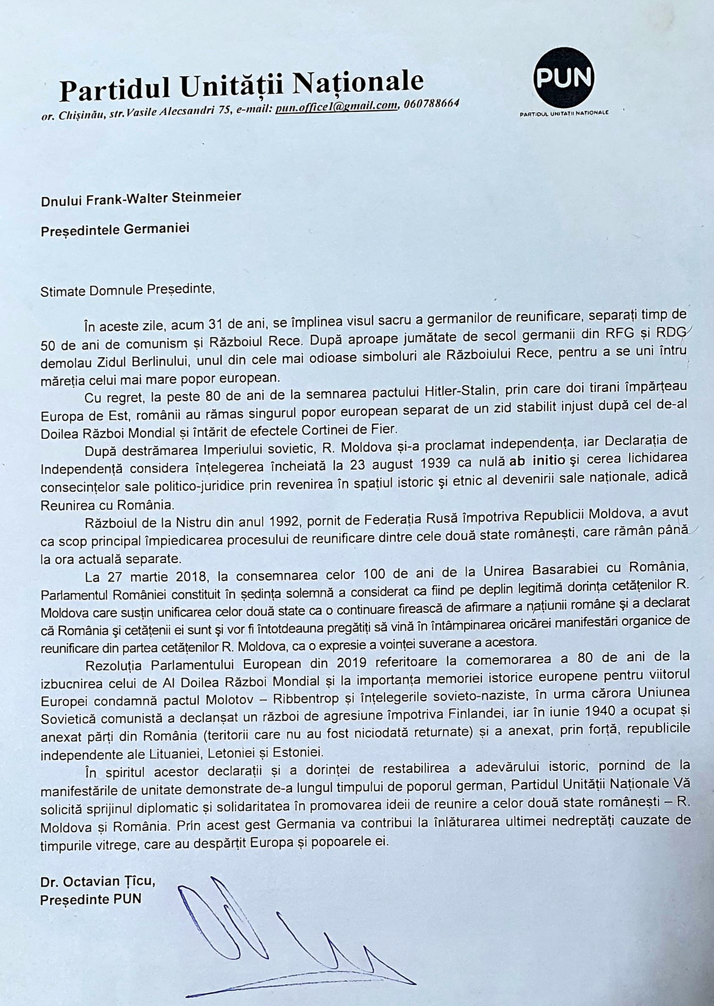 „Prin acest gest, Germania va contribui la înlăturarea ultimei nedreptăți cauzate de timpurile vitrege, care au despărțit Europa și popoarele ei”, argumentează liderul PUN, Octavian Țîcu, prin intermediul unei scrisori adresate președintelui Germaniei.