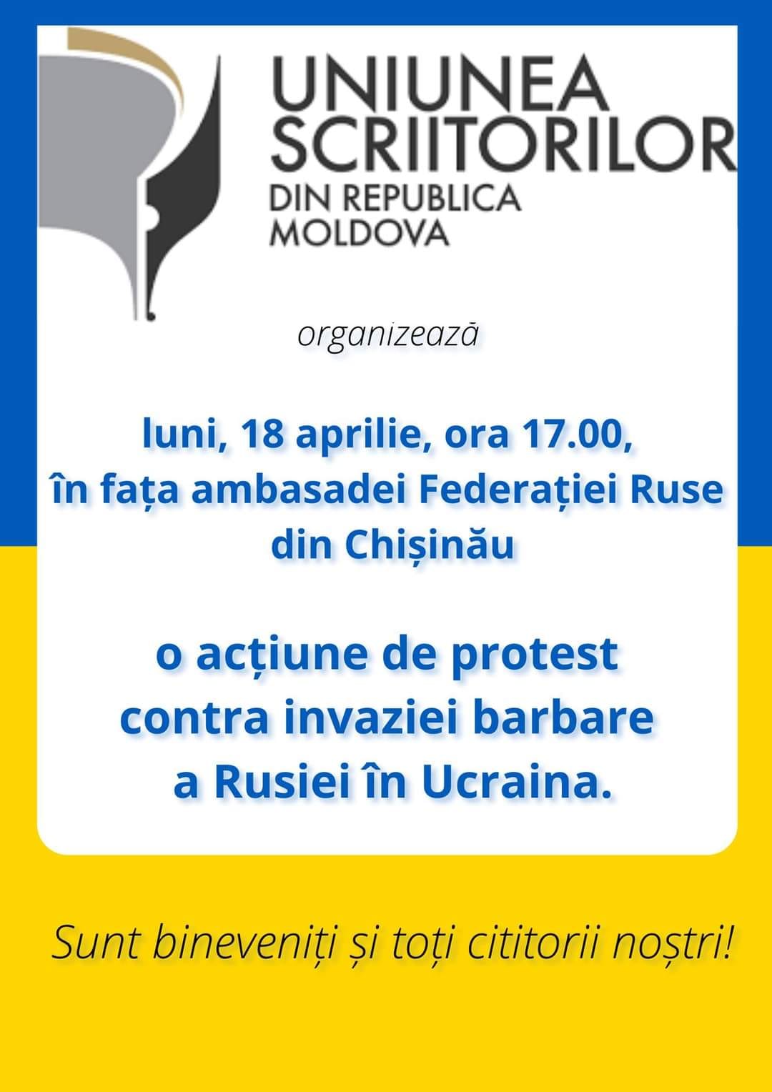 Uniunea Scriitorilor din Moldova îndeamnă cetățenii R. Moldova să participe la o acțiune de protest care va avea loc în seara zilei de luni, 18 aprilie, în fața Ambasadei Federației Ruse de la Chișinău.