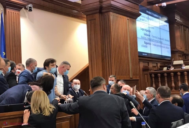 VIDEO // Momentul în care deputații s-au luat la BĂTAIE astăzi în Parlament, după ce socialiștii și cei din Partidul „Șor” au început să voteze rapid proiectele de legi contestate de opoziție: Batrîncea, fugărit de la tribună