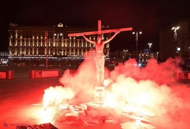 Bărbat „răstignit” pe o cruce în fața sediului central al FSB din Moscova, în semn de protest. În august s-a „spânzurat” de un pod