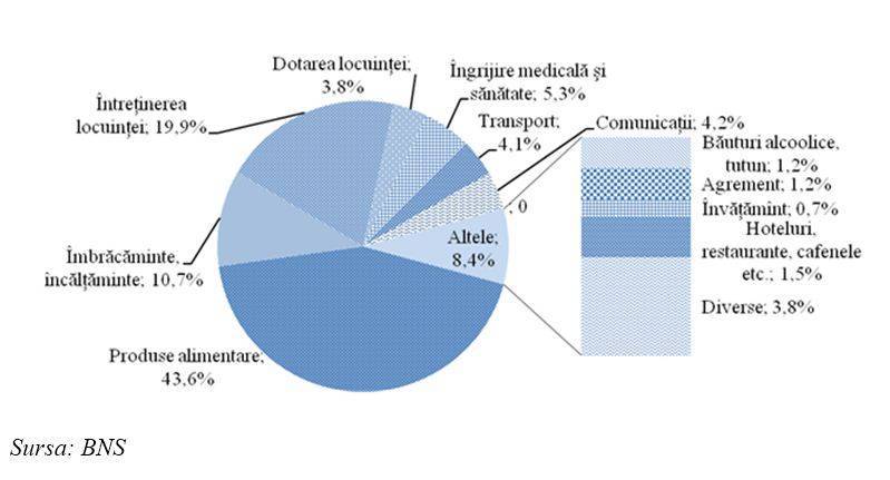 Cine este de vină în toată situația asta? Desigur că noi. De ce? Pentru că mâncăm prea mult. Cheltuim aproape jumătate din ce am câștigat pe mâncare. Nu credeți? Iată datele statistice. 44% din cheltuieli se duc pe produse alimentare, 20% - pentru întreținerea locuinței. În total, circa 2/3 din cheltuieli. Iar acestea sunt și ele relevante – tocmai 1 832 de lei în medie pe o persoană. Adică, dacă asta era mai mult de 100 de euro, acum deja e mai puțin de 100 de dolari. Vorba ceea – mulțumim partidului!