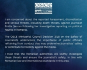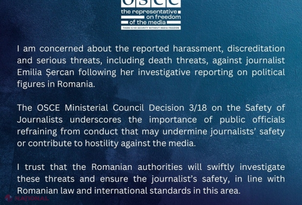 OSCE cere autorităților române să oprească hărțuirea și amenințările cu moartea la adresa Emiliei Șercan
