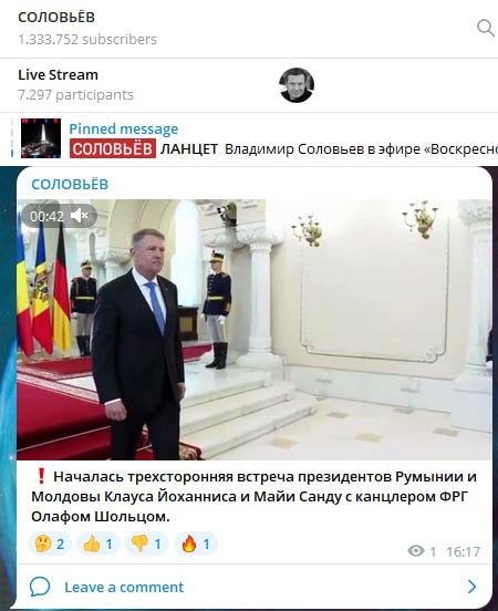 Această întrevedere este urmărită cu mare atenție de proppagandistul de la Kremlin, Vledimir Soloviov. La puțin timp după ce Administrația Prezedențială de la București a postat videoul cu întâlnirea Maiei Sandu, Soloviov a semnalat evenimentul pe canalul său de Telegram.