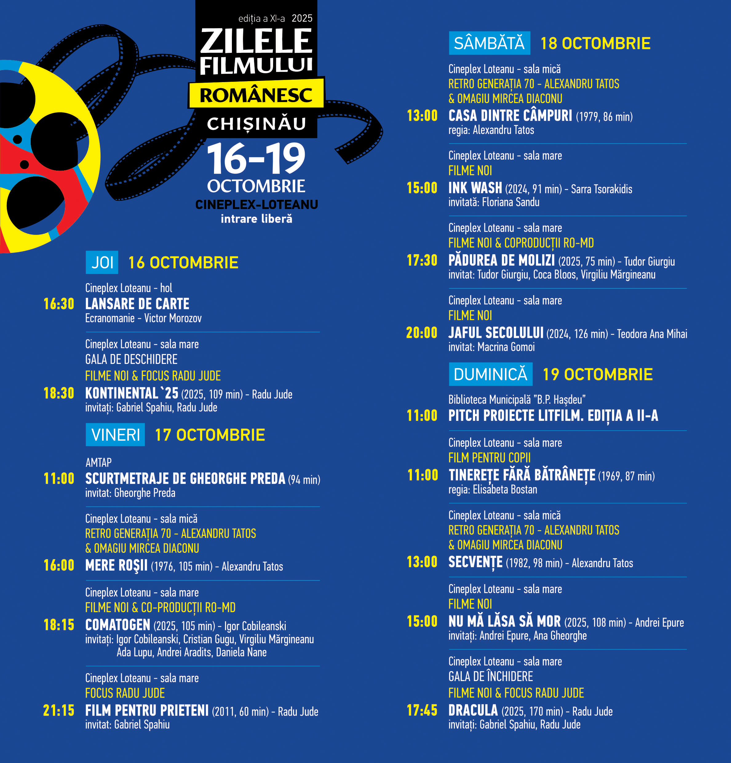 Proiectul Zilele Filmului Românesc la Chișinău, ediția a XI-a este finanțat de: Ministerul Culturii al Republicii Moldova, Institutul Cultural Român „Mihai Eminescu” la Chișinău, Centrul Național al Cinematografiei din Moldova, Centrul Național al Cinematografiei din România și Uniunea Cineaștilor din România.